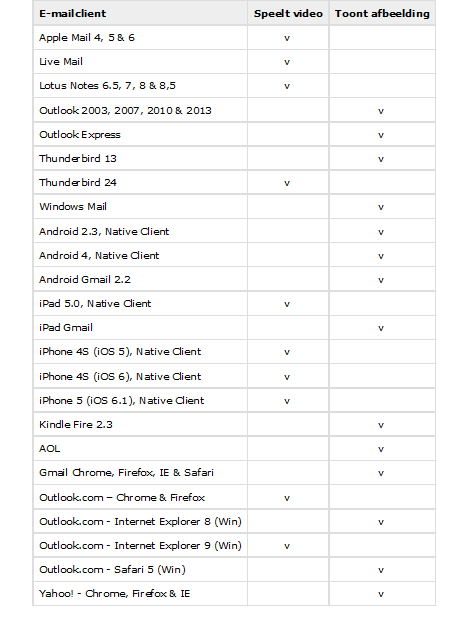 Hieronder vind je een duidelijk overzicht van de e-mailclients die wel HTML5-video ondersteunen en diegenen die zullen verwijzen naar de afbeelding.