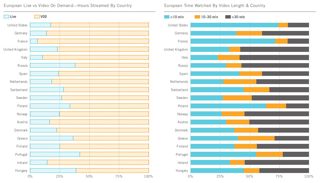 De wereldwijde statistieken verschillen niet veel van de Nederlandse, zeker qua kijkgedrag niet. In Nederland is ongeveer 20% van alle uren streaming video live video, ongeveer even veel als in Amerika. Voorlopers in Europa wat het aantal gekeken live-uren betreft zijn Portugal, Rusland en Hongarije. In Nederland worden in vergelijking met Amerika veel lange video’s bekeken, in vergelijking met andere Europese landen is het verschil niet erg opvallend. Iets minder dan een kwart van de bekeken video’s in Nederland heeft een lengte van minder dan 10 minuten, een kwart een lengte van tussen de 10 en 30 minuten en iets meer dan de helft van de bekeken video’s heeft een lengte van meer dan 30 minuten.