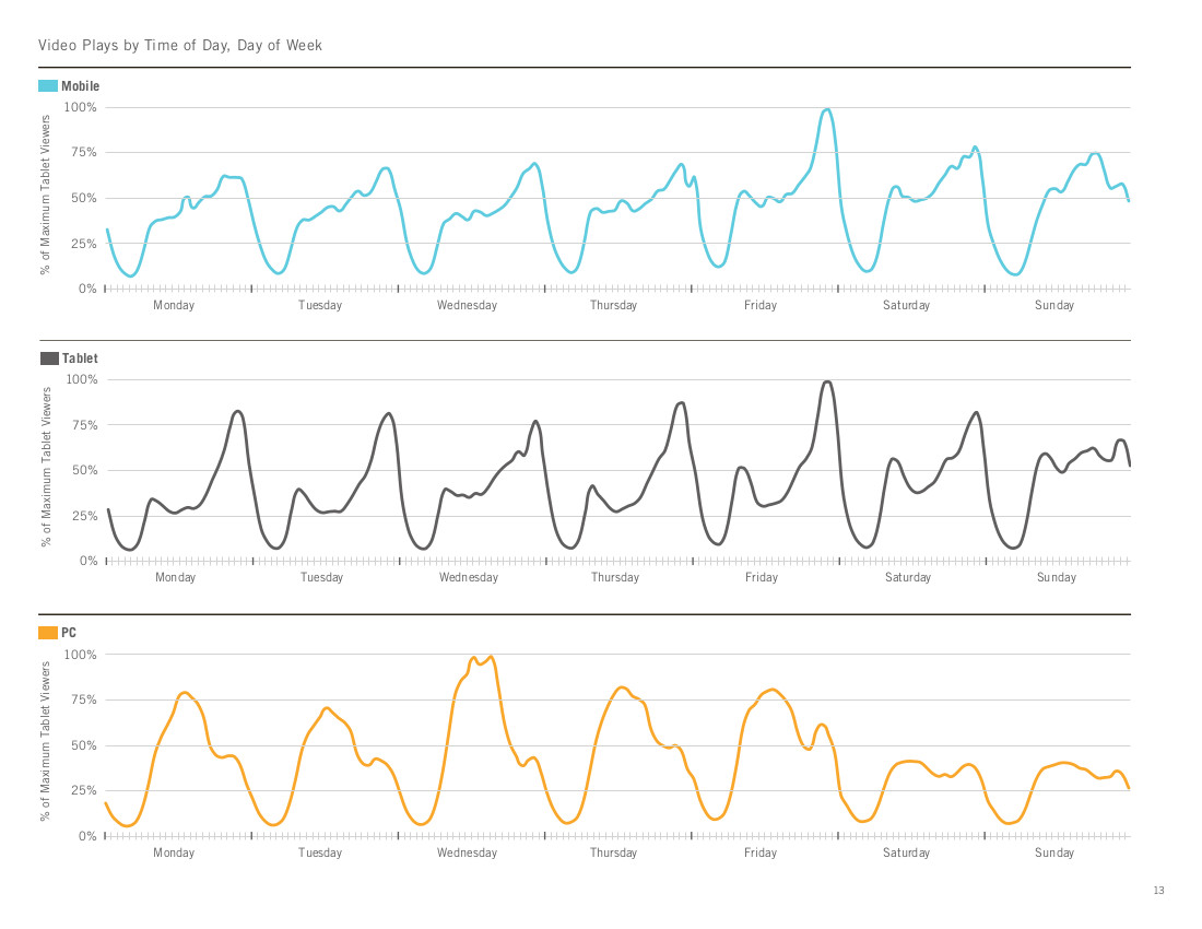 Qua kijkgedrag valt op dat smartphones en tablets steeds meer als eerste scherm worden gebruikt in plaats van de TV. Vooral op vrijdagavond en in het weekend wordt er veel video gekeken via deze apparaten. Ook om 7 uur ’s ochtends, wanneer mensen naar het werk reizen, wordt er veel video via mobiele devices gekeken. In het weekend wordt minder video gekeken via de PC. De computer wordt voornamelijk gebruikt om onder werktijd video te bekijken en om korte video’s (minder dan 6 minuten) te kijken. Streaming-TV’s en connected gameconsoles worden ook meer gebruikt om langere video’s te kijken. Kijkers via deze apparaten zijn het meest betrokken: meer dan de helft van de kijkers kijkt een video volledig uit. Daarnaast wordt er tegenwoordig meer tijd besteed aan digitale devices dan voor de TV.