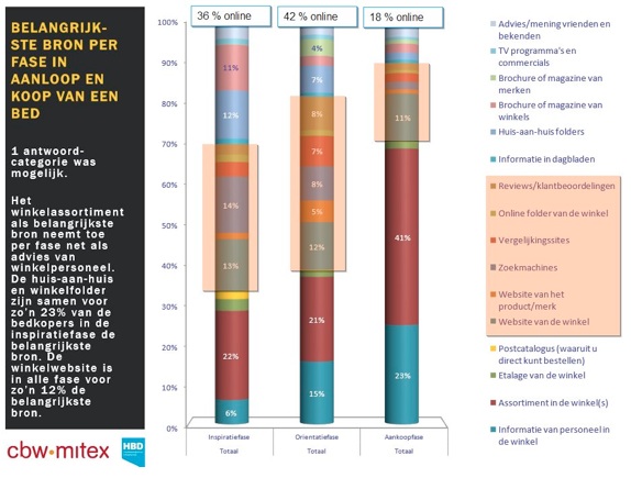 Onderzoek van de meubelbranche-organisatie Inretail (CBW-Mitex) over het gedrag van een koper tijdens verschillende fases van het aankoopproces laat dit ook zien. In november 2012 is 359 boxspringkopers gevraagd naar de kanalen die werden gebruikt tijdens het aankoopproces. Opvallend was dat onder deze respondenten vooral in de inspiratiefase (ongeveer 40 procent) en de oriëntatiefase (ongeveer 35 procent) vaak online bronnen zoals vergelijkingssites, zoekmachines en websites van winkels als belangrijkste bron voor het vergaren van informatie noemen (lees hier het hele rapport van Inretail (CBW-Mitex).