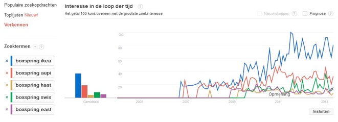 Uit de cijfers van boxspringbeleving.nl en ook vanuit Google Trends zien we een steeds grotere verschuiving naar de lager geprijsde boxsprings. Het is moeilijk aan te geven vanuit deze bronnen wat de oorzaak is van deze verschuiving. Wellicht hebben de goede testen in de consumentengids ervoor gezorgd dat steeds meer mensen overwegen om een voordelig geprijsde boxspring bij IKEA te kopen. We zien in ieder geval dat het zoekvolume op “boxspring IKEA” 2 x groter is dan het volume op “boxspring Auping”. Dit terwijl ze in 2009 nog vergelijkbare volumes hadden.