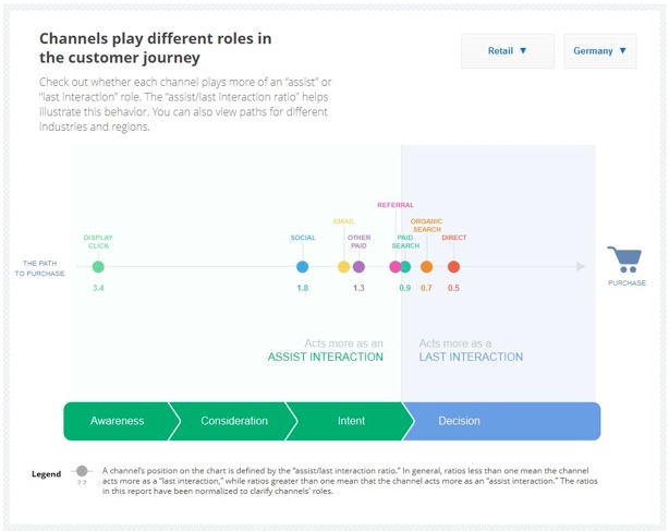 In het onderzoek wordt onderscheid gemaakt tussen assisted interactions en last interactions. De assisted interactions zitten vooral in de inspiratiefase van de customer journey en zijn bijvoorbeeld kliks op een banner, nieuwsbrieven maar ook contacten via social media. De last interactions beschrijven het laatste contact dat een klant heeft met de webwinkel. Hierin zitten de meest relevante kanalen (SEO) en direct verkeer. In het overzicht van Google is goed te zien welke bronnen een consument online raadpleegt voordat hij een aankoop doet (branche: retail, land: Duitsland):