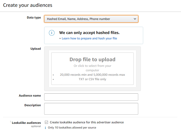 De Amazon DSP biedt naast data nog een unieke faciliteit, namelijk het importeren van CRM-files met e-mailadressen, namen, telefoonnummers of anderszins unieke klantkenmerken. Uiteraard moeten deze eerst ontsleuteld worden. Op deze manier kan een marketeer het klantenbestand inladen in de DSP en bestaande klanten targeten of uitsluiten. Ook kun je lookalikes vinden. De functionaliteit in de Amazon DSP lijkt op Facebook audiences bij Facebook ads. Deze CRM-uploadfunctionaliteit kun je combineren met de shopper en intent data in het Amazon platform.