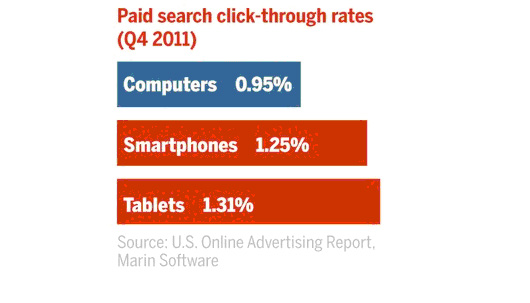 De CTR (Click-Trough-Rate) van tablets en smartphones bij advertenties in Google liggen een stuk hoger dan via een “traditionele” computer. Dit bleek uit een onderzoek van Marin Software onder 1.000 adverteerders (waaronder Macy’s en Hotels.com) in Amerika.