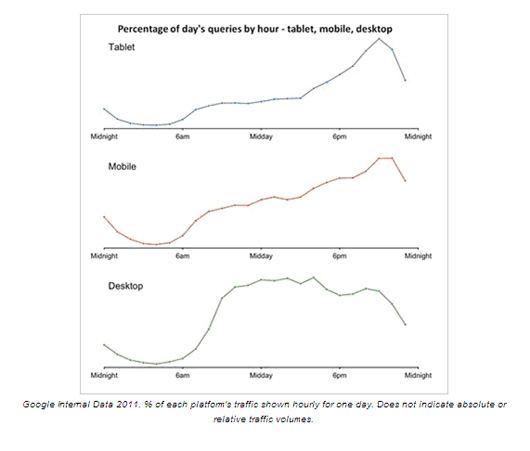 Het laatste opvallende verschil tussen mobiele en desktopgebruikers is het tijdstip van zoeken. Uit de data van Google Mobile Ads blijkt dat de meeste zoekopdrachten overdag via desktop plaats vinden, terwijl voor mobiele gebruikers dit vooral 's avonds gebeurd. De meeste zoekopdrachten via mobiele devices gebeuren rond 21.00 ’s avonds. Kortom, mobiel wordt voornamelijk gebruikt op het moment dat iemand onderweg is, terwijl de desktop voornamelijk wordt gebruikt tijdens werktijden.
