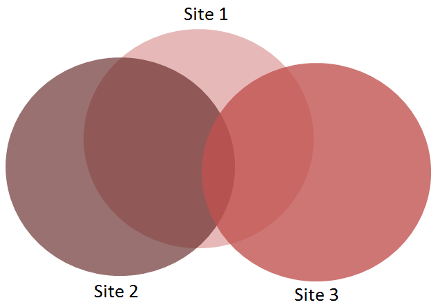 Met name dit laatste inzicht is erg interessant voor de optimalisatie van toekomstige mediainzet. Binnen een bereikscampagne kun je dit inzicht gebruiken om de overlap zoveel mogelijk te elimineren en te kiezen voor websites die bereik toevoegen. In onderstaande figuur zie je de overlap in bereik van drie vergelijkbare sites. Hierin is meteen duidelijk dat de combinatie van website twee en drie de meest optimale combinatie is voor het realiseren van uniek bereik. Site een heeft grote overlap met beide andere sites en voegt daarom minder toe.