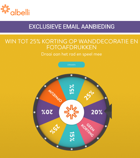 Spelletjes passen goed bij het thema Valentijn: deze campagne mag namelijk zeker entertainment bevatten. Kies bijvoorbeeld voor een spin-the-wheel waarbij je ontvanger een kortingscode kan winnen.