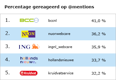 Hoe vaak reageren bedrijven nu eigenlijk op mentions? Gemiddeld reageren de actieve webcareteams van de top 100 adverteerders op 13,8% van de mentions. BCC beantwoordt relatief gezien de meeste mentions (41,0%), gevolgd door Nuon (36,2%) en ING (35,9%). Dit aantal lijkt op het eerste gezicht weinig, maar je moet er rekening mee houden dat niet alle mentions gericht zijn aan de klantenservice. Het maakt vaak uit wat voor soort berichten het zijn (neutrale statusupdates, klachten of problemen) en of het webcareteam vindt dat er op gereageerd moet worden (gekozen webcarestrategie).