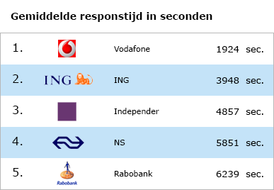 Vodafone beantwoordt mentions met een gemiddelde van 32 minuten het snelst. ING (68 minuten) en Independer (81 minuten) staan op nummer twee en drie. Vodafone is niet alleen het bedrijf met de snelste responstijd, het bedrijf heeft ook de meeste vragen beantwoord via Twitter. Het bedrijf laat daarmee zien dat het mogelijk is om via webcare de klanten snel te bedienen.