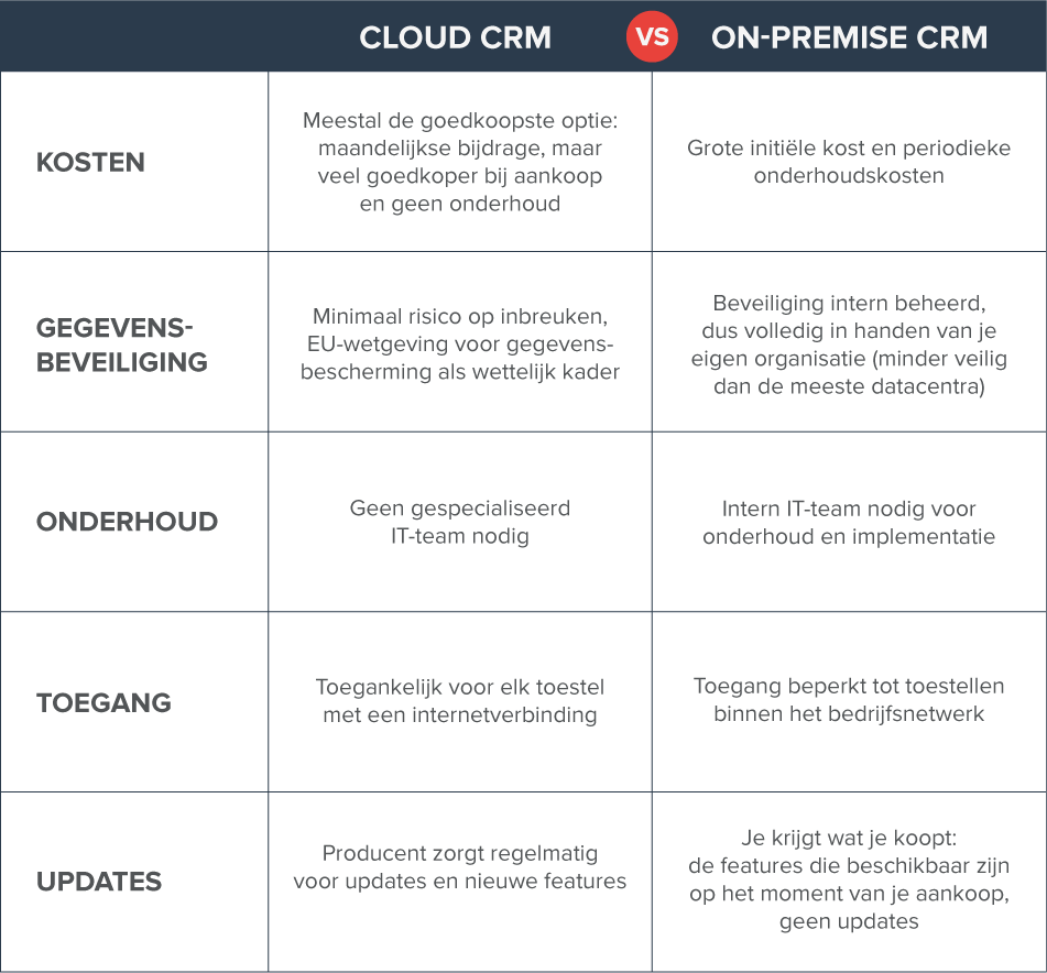 Of een online of juist een offline CRM-systeem voor jou de beste keus is, kunnen wij niet zeggen. Het een is niet beter dan het ander. We kunnen jou deze keuze wel gemakkelijker maken met behulp van deze verschillen. Cloud CRM versus on-premise CRM:
