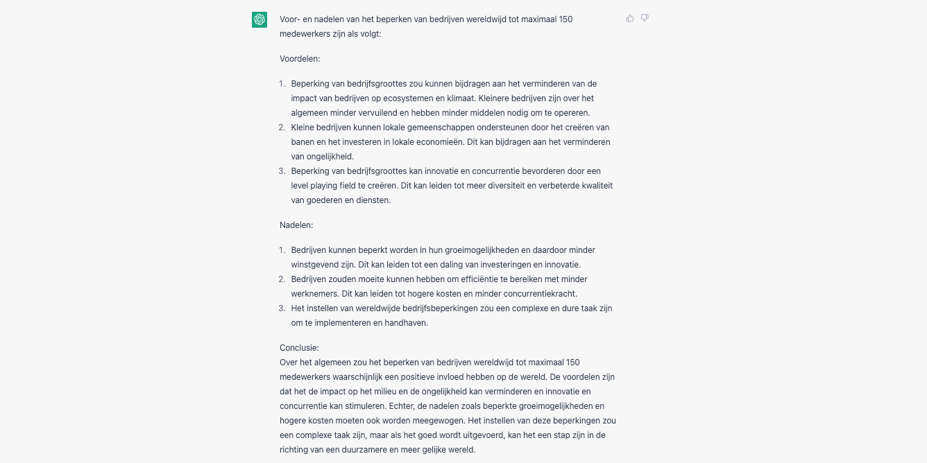 “Geef een opsomming van de voor- en nadelen als bedrijven wereldwijd maximaal 150* medewerkers zouden mogen hebben. Neem hier ook de afweging van de impact van bedrijven op ecosystemen, klimaat en ongelijkheid in mee.”