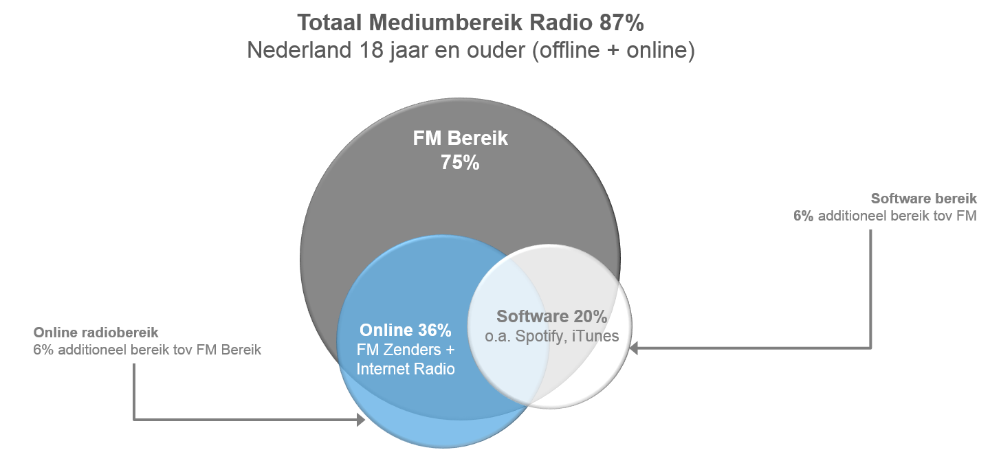 - Totaal mediumbereik radio: het percentage Nederlanders dat aangeeft weleens naar de radio te luisteren, thuis of ergens anders (min. 10 minuten). Dit is inclusief het beluisteren van FM-zenders via de radio, online radiozenders en de radiomogelijkheid op programma’s zoals Spotify, Deezer, iTunes en Podcasts.