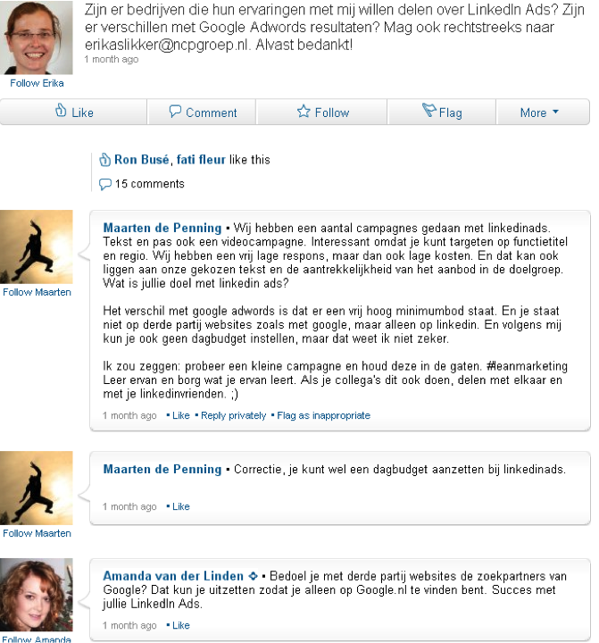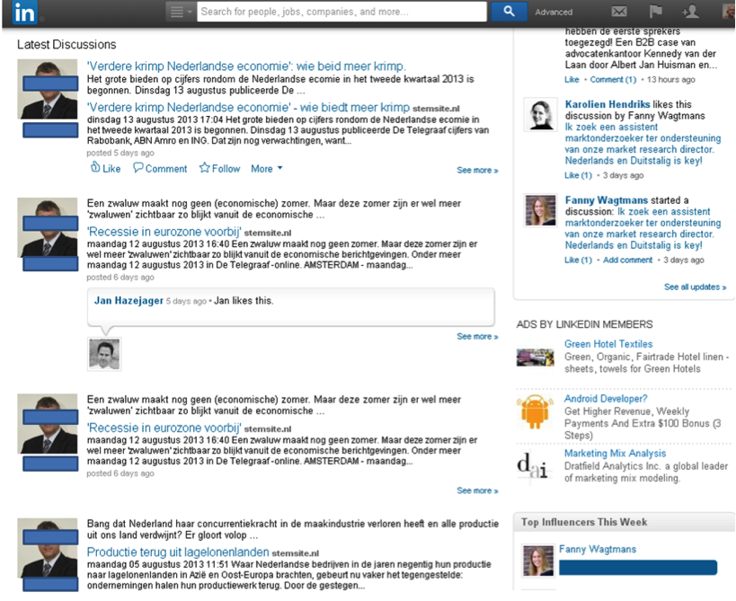 Dit is een screenshot van de NIMA-groep (medio augustus). Eén persoon is hier verantwoordelijk voor 5 van de 6(!) laatste updates in een groep met meer dan 8.000 leden. Als de content interessant was, is het tot daar aan toe, maar de links hebben niet direct betrekking op het MarCom vak en slechts één bericht lokt een (gezonde) discussie uit. Dergelijk gedrag heeft ertoe geleid dat ik me al bij menige groep heb uitgeschreven.
