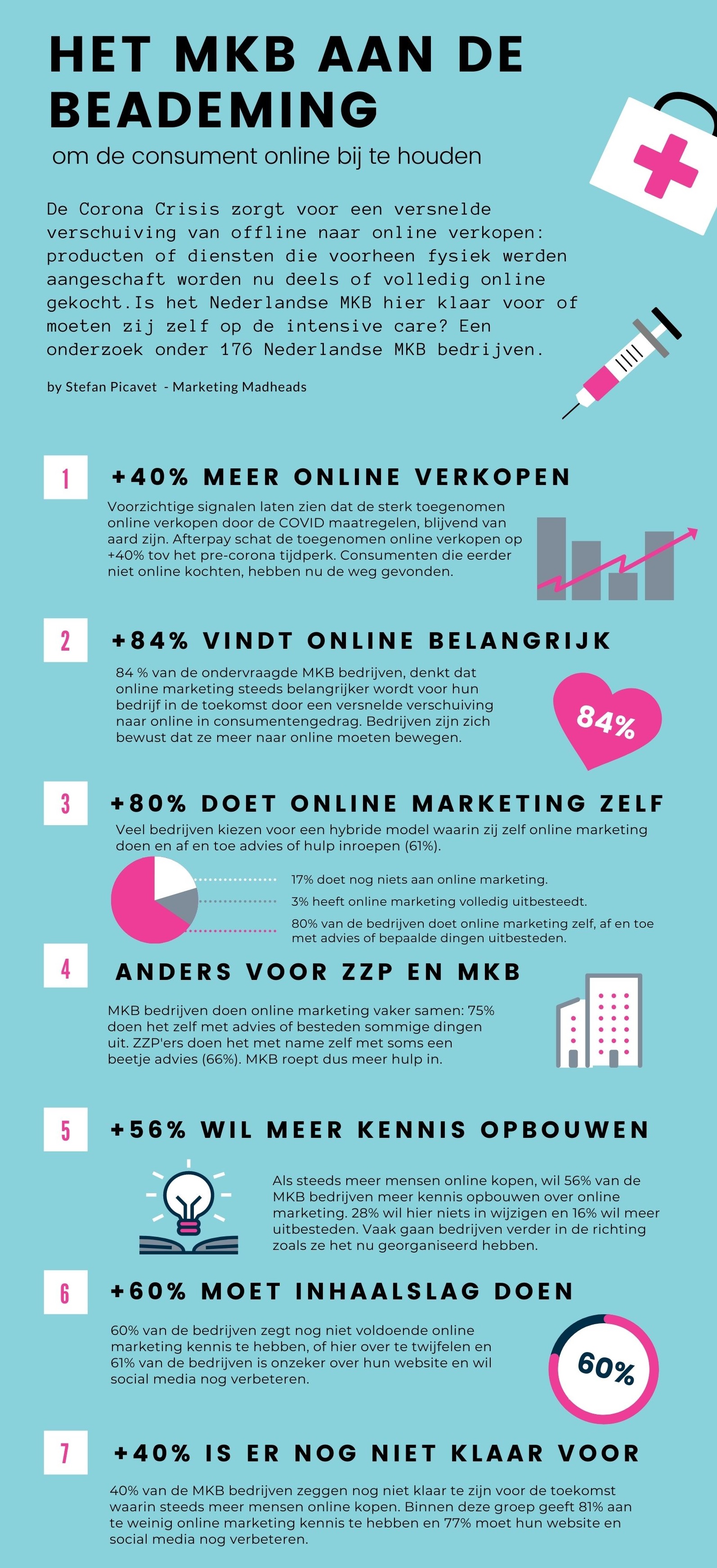 Uit ons onderzoek, onder 176 mkb-bedrijven blijkt dat deze bedrijven zich door de coronacrisis wel bewust zijn geworden van het belang van online marketing voor hun bedrijf. Zo geeft 84 procent van de bedrijven aan dat ze verwachten dat online marketing steeds belangrijker voor ze gaat worden in de toekomst, door de verschuiving van consumentengedrag naar online. Ondanks dat de meeste ondernemers zich hiervan bewust zijn, geeft 77 procent ook aan dat ze nog wel een inhaalslag moeten maken met hun website en/of social-mediaprofielen. Deze zijn op dit moment, volgens de bedrijven zelf, nog niet van voldoende kwaliteit om hun doelgroep goed online te kunnen bereiken.