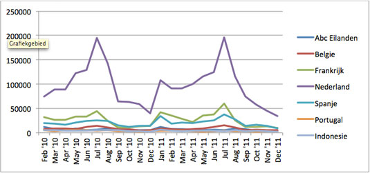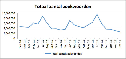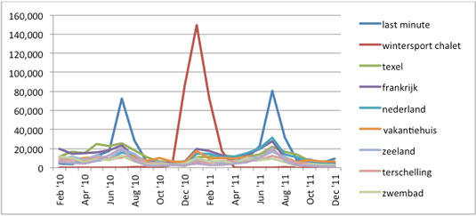 De zoektermen “last minute” en “wintersport” zijn het meest populair voor het zomer- en winterseizoen. Van juni tot oktober zien we een piek op “last minute”, deze piek was in 2011 hoger dan 2010. Wellicht werd deze stijging veroorzaakt door de kwakkelende zomer.