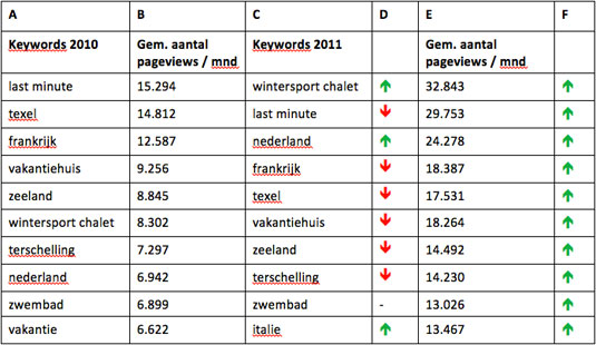 Wel zien we het aantal zoekopdrachten in de groep Vakantie fors toenemen (zie kolom F in onderstaande tabel). Ook zien we een groot verschil tussen de specifieke zoekopdrachten van 2010 ten op zichte van 2011.