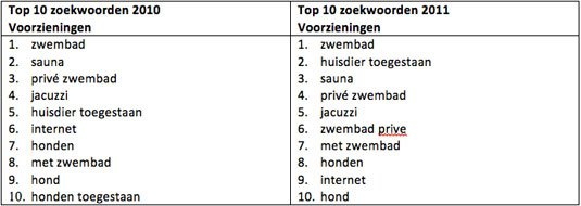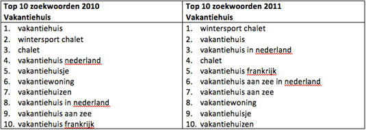 Voor de kalenderjaren 2010 en 2011 staat onderstaand de top 10 weergegeven van zoekwoorden gerelateerd aan vakantiehuis: