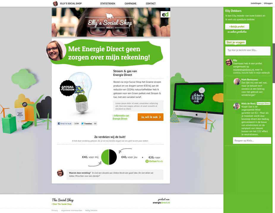 Door integratie met sociale netwerken als Facebook en Twitter is het voor klanten eenvoudig om hun shop onder de aandacht te brengen van vrienden, kennissen en volgers. Bij verkoop ontvangt de klant/winkeleigenaar een vergoeding, vergelijkbaar met een affliate fee. Die vergoeding kan al bij de start oplopen tot 100 euro, bijv. als zij een abonnement sluiten bij Energiedirect. Overigens is de beloning zichtbaar voor de kopers en kunnen de verkopers ervoor kiezen deze vergoeding te delen met de koper of met een goed doel als Oxfam Novib – of allebei, zoals in onderstaand voorbeeld.