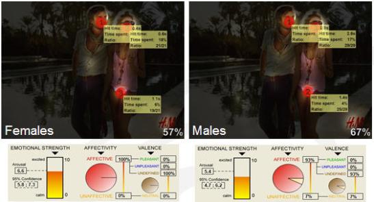 In de tweede advertentie van H&M, waarvan we even uitgaan dat deze voor zowel mannen als vrouwen is ontworpen zien we wederom verschillen. De vrouwelijke respondenten reageerden sterker op de advertentie dan de mannen. In de advertentie valt verder op dat het kijkgedrag ook verschillend is. De mannelijke respondenten bleken meer getriggerd te zijn door de bikini van de vrouw.