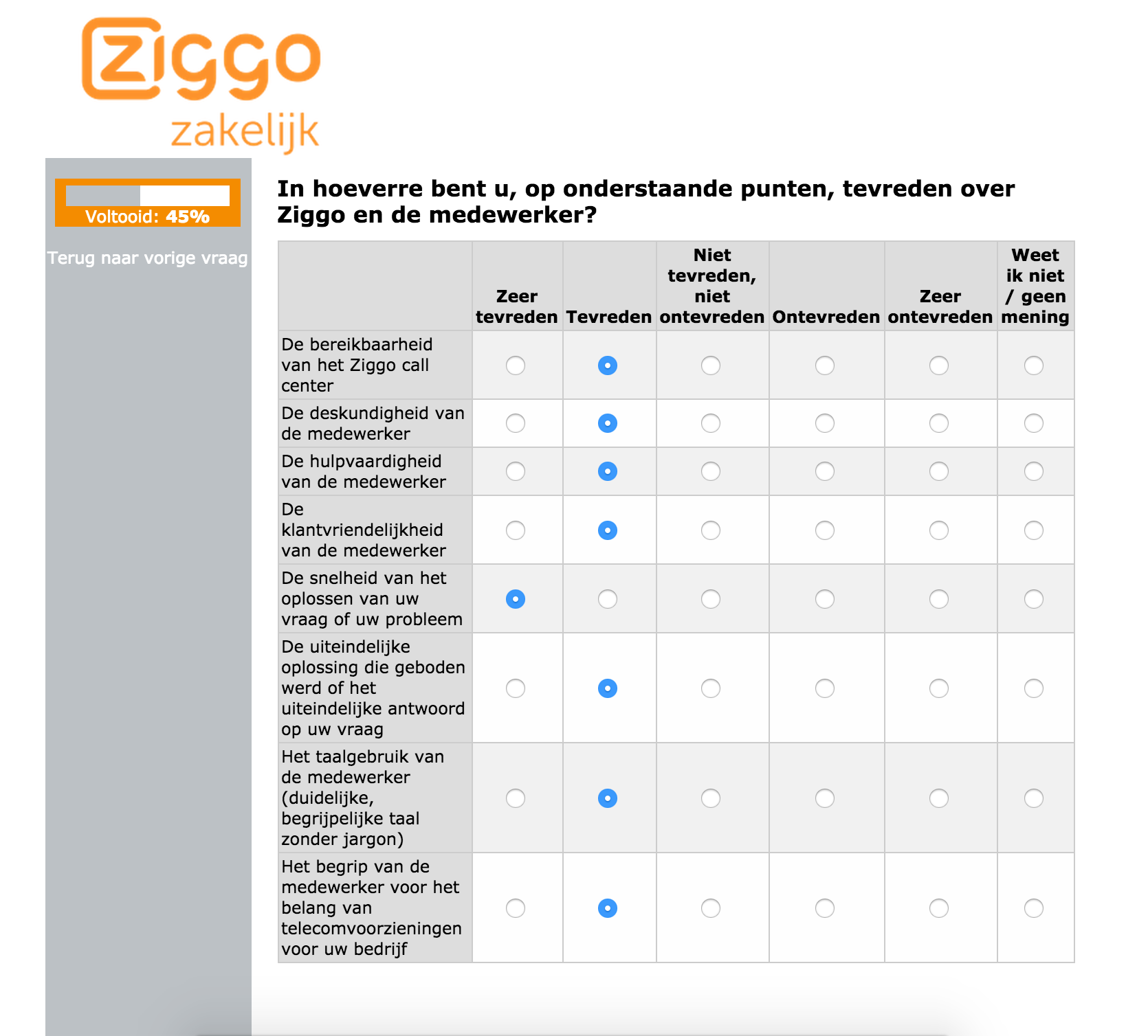 Een ander voorbeeld gaat over een contact dat ik recent met de helpdesk van Ziggo had. Het telefoontje duurde nog geen minuut, maar werd doodleuk opgevolgd met een vragenlijst van vijf minuten om het gesprek te evalueren. Hoe vaak ik over mijn probleem gebeld had, of de medewerker jargon gebruikte en of ik aan al mijn vrienden ging vertellen hoe goed ik in die minuut geholpen was?