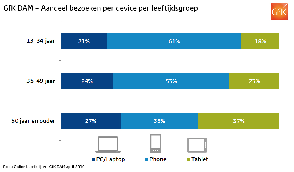 Zo’n 50 procent van alle bezoeken vindt plaats op smartphones, zegt GFK. Vooral de jongere generatie heeft hier een belangrijk aandeel in.