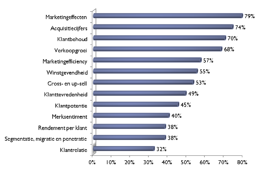 Als er aan de respondenten wordt gevraagd welke prestatie-indicatoren worden gemeten, worden vooral de bekende indicatoren genoemd. Onderstaande grafiek laat duidelijk zien dat de meer traditionele KPI’s als marketingeffecten, acquisitiegegevens, klantbehoud en verkoopcijfers als aanleiding voor de uitvoering van klantenanalyses worden genoemd.