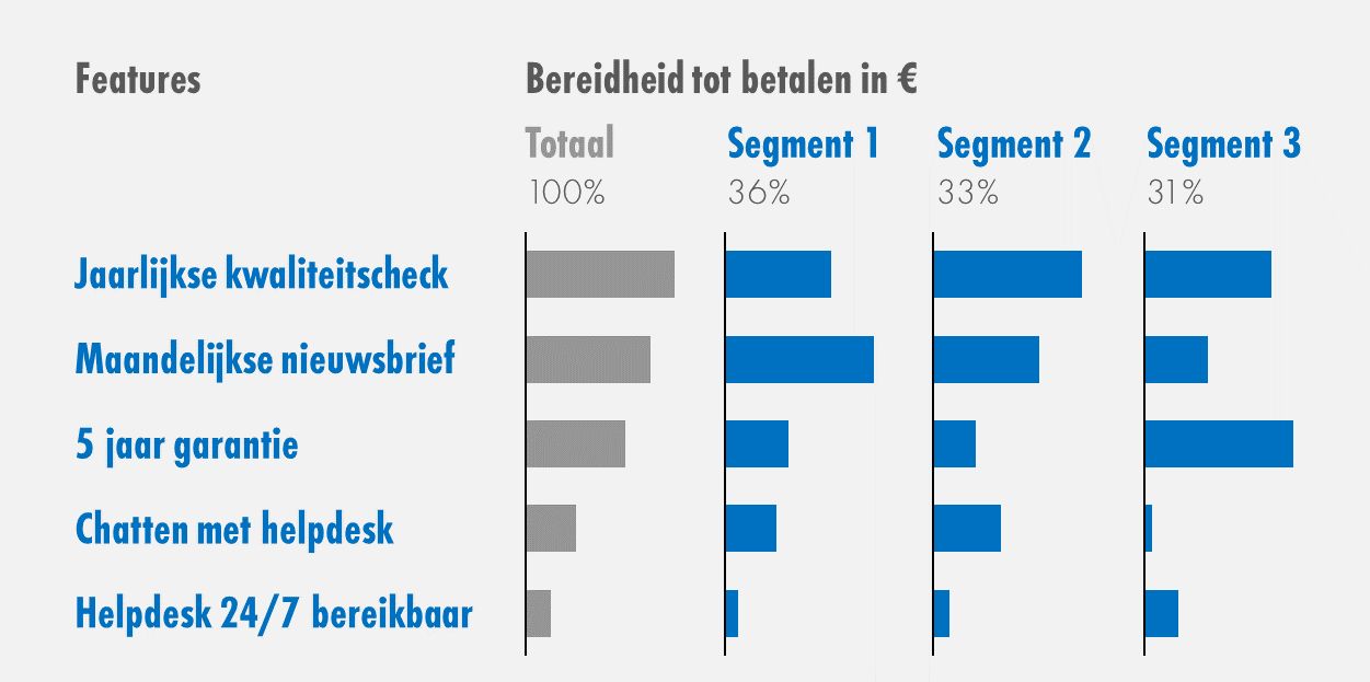 Waar de een veel geld voor wil betalen, is voor de ander waardeloos. Binnen een beoogde doelgroep zijn bijna altijd segmenten te onderscheiden die verschillen in hoeveel en waarvoor ze willen betalen.
