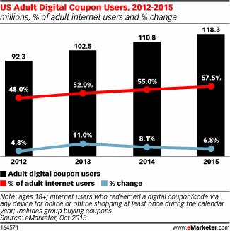 In de Verenigde Staten is het fenomeen mobile couponing inmiddels breed geaccepteerd. Uit een onderzoek van eMarketer komt naar voren dat 52 procent van de Amerikaanse consumenten ouder dan 18 jaar in 2013 gebruik zal maken van digitale coupons. Naar verwachting groeit dit percentage in 2015 naar 57,5% ofwel 118,3 miljoen consumenten. Waar in het verleden met name gebruik werd gemaakt van SMS en MMS coupons worden tegenwoordig steeds vaker mobiele applicaties gebruikt om coupons te verkrijgen.