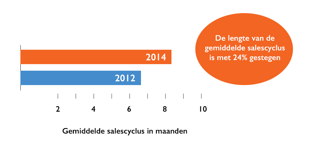 Het eerste probleem beschreef ik al: campagnes zijn vaak kortdurend, terwijl complexe b2b-aankooptrajecten lang duren. Dat zorgt voor een kloof tussen klant en marketeer. En die kloof wordt steeds groter. Uit onderzoek van Sirius Decisions blijkt dat de gemiddelde duur van een b2b-salescyclus tussen 2012 en 2014 met 24 procent is gestegen, naar gemiddeld meer dan acht maanden. Hoeveel van jouw campagnes duren acht maanden?