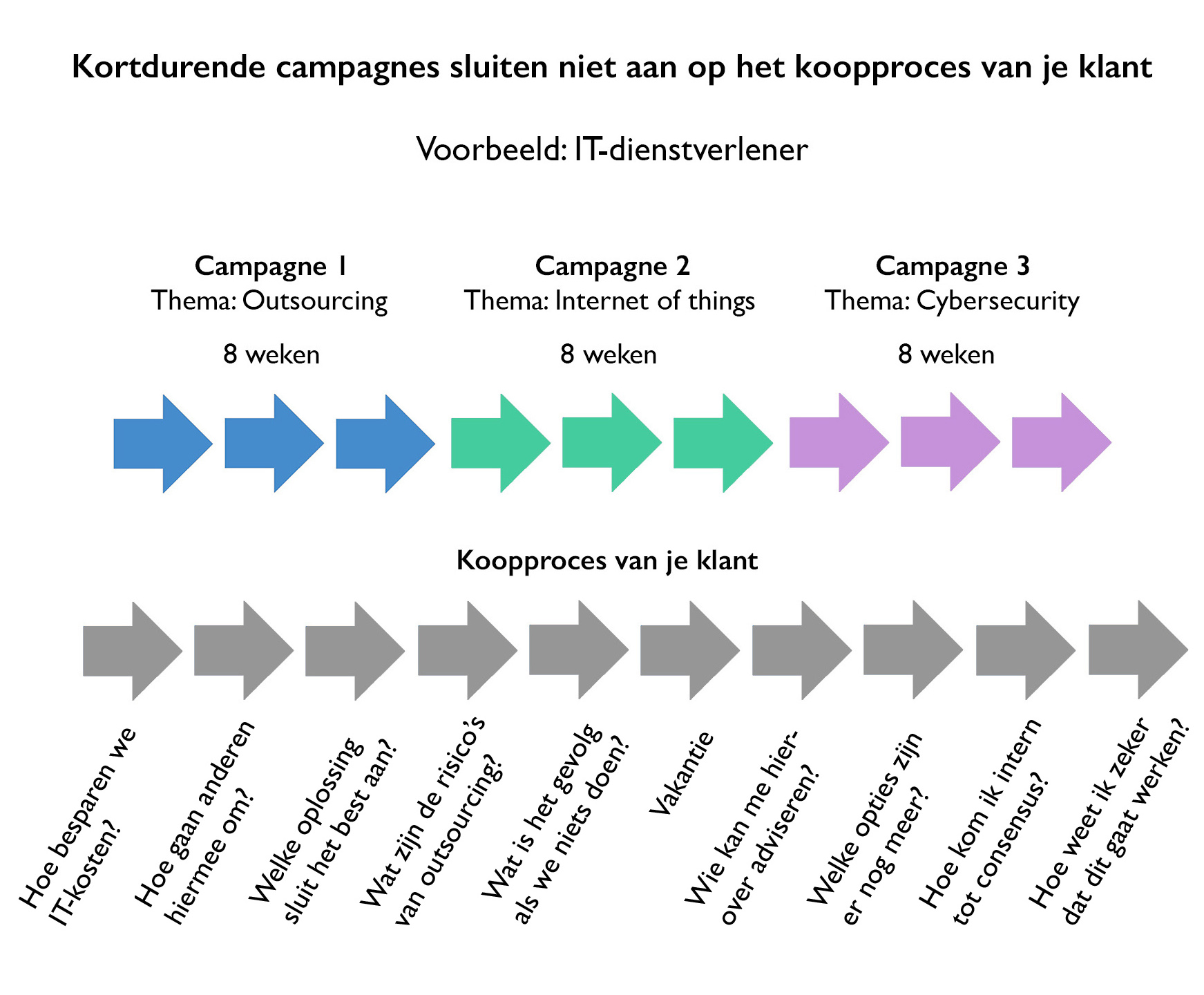 Verplaats je eens in de persoon die je met zo’n campagne probeert te bereiken. Je ziet een whitepaper voorbij komen die je aandacht trekt. De titel beschrijft precies het probleem waar jij binnen je bedrijf ook mee worstelt. Je downloadt de whitepaper. Een week later ontvang je een uitnodiging voor een webinar over hetzelfde onderwerp. Maar je hebt het die week zo druk, dat je het webinar laat schieten. Daarna blijft het stil. Totdat je een paar weken later van hetzelfde bedrijf een serie e-mails over een ander onderwerp ontvangt. Net nu jij meer tijd hebt om aan de slag te gaan met het onderwerp dat oorspronkelijk je interesse wekte. Sorry, de vorige campagne is afgelopen!