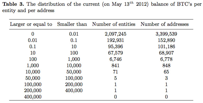 Twee onderzoekers, Dorit Ron en Adi Shamir, publiceerden in 2012 onderstaande tabel. Bijna 60 procent van alle Bitcoin-munten waren slapende. Nog interessanter is dat 97 procent van alle Bitcoin-rekeningen minder dan 10 bitcoins bevatten en slechts 78 “entiteiten” meer dan 10.000 Bitcoins bezaten. Een kleine groep dus die de meerderheid in handen heeft, het is net de echte wereld.