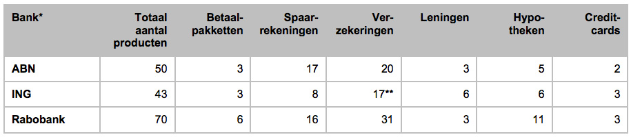 * Bron: eigen telling op de .nl-websites van ABN, ING, Rabobank; alleen particulieren en excl. beleggingsproducten.