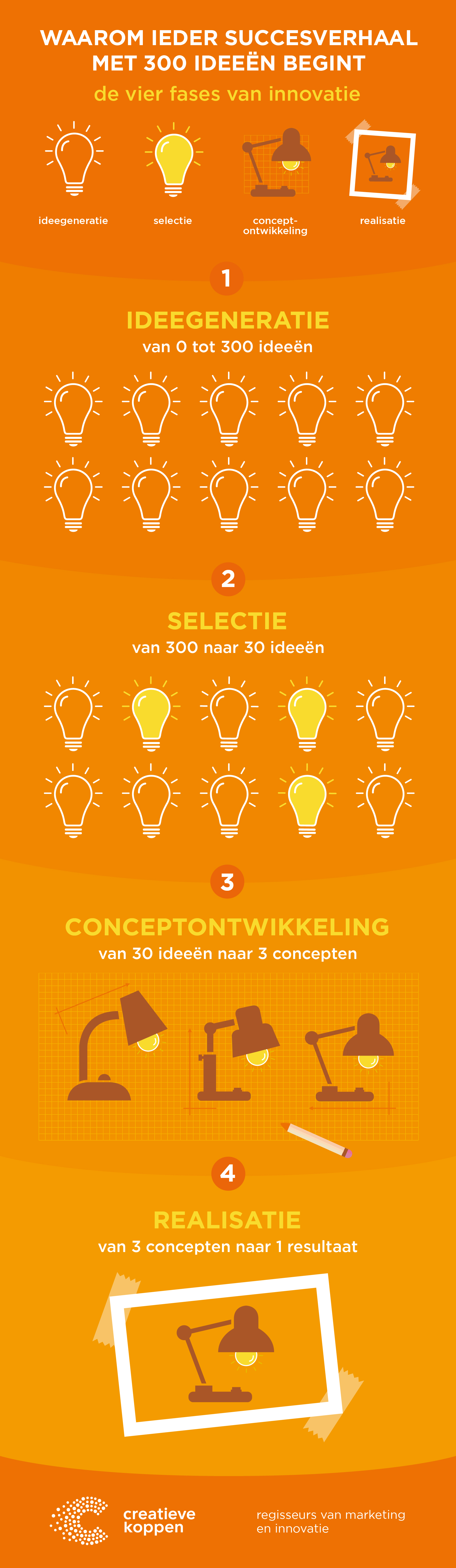 Maar zoals bij veel krachten moet je wel weten hoe je deze effectief en efficiënt inzet. Een van de meest gemaakte fouten in het creatieve proces is het verzamelen van te weinig ideeën. Zonde, want deze fase is niet alleen heel interessant, we weten inmiddels ook dat er zo’n 300 ideeën nodig zijn om tot een goed resultaat te komen.