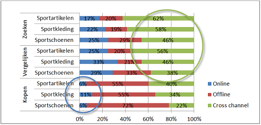Je zou denken dat ze hiermee vrij spel geven aan de pure online shops zoals Runningdirect.nl, Plutosport.nl, en Wehkamp.nl. Ondanks dat de zoektocht naar de sportschoen een cross channel aangelegenheid is, kocht de Nederlandse consument in 2011 de sportschoen gewoon in de fysieke winkel (72%). Wel verwacht ABN AMRO dat ook het aankoopproces tegen 2015 een cross channel aangelegenheid gaat worden (39%). Echter, het offline shoppen zal nog erg belangrijk blijven.