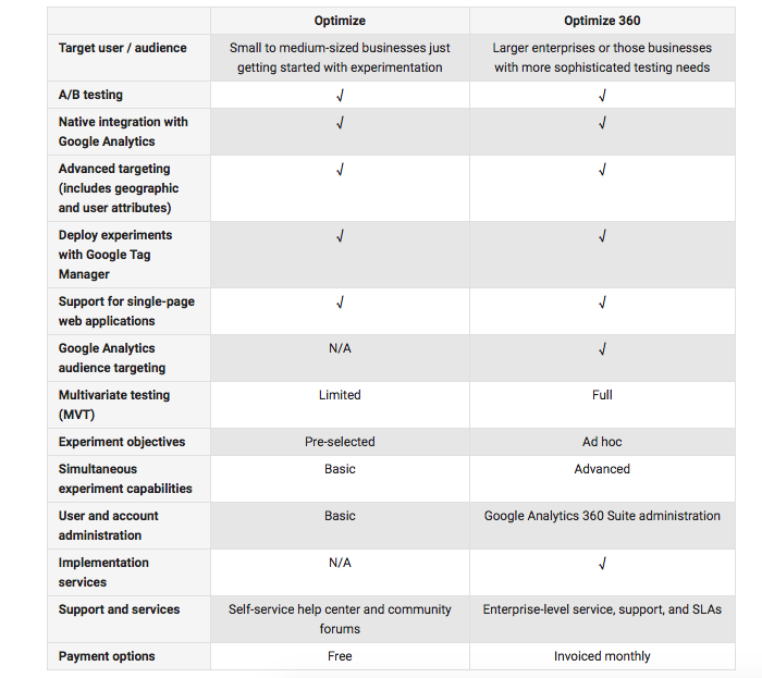 Het grootste voordeel van Optimize, is dat iedereen ermee kan beginnen. De gratis versie biedt bijna alle functionaliteiten die nodig zijn voor het opzetten van een A/B test- of personalisatiecampagne. De gratis versie heeft een aantal limieten tegenover de betaalde 360-variant, namelijk: