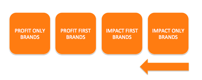 Aan de andere kant van het spectrum staan de Impact Only Brands. Dit zijn de merken die direct zijn ontstaan vanuit een hoger ideaal. Het uit de wereld helpen van een bepaalde ziekte of een misstand zoals armoede, honger of kindsoldaten. Het zijn vaak erg sterke merken die staan voor specifieke waarden en een gepassioneerde en gedreven achterban hebben.