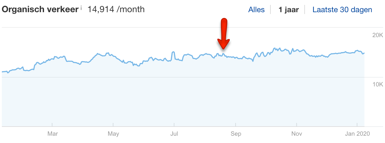 Als we naar een inschatting van het organisch verkeer kijken, dan zien we dit inderdaad terug: het organisch verkeer is na livegang (de rode pijl) de helft van wat het geweest is: