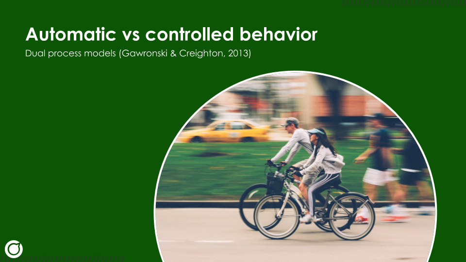 De eerste stap naar gedragsverandering is begrijpen hoe gedrag überhaupt tot stand komt. En daarvoor biedt (sociale) psychologie veel inzichten. Een van de belangrijkste is het onderscheid tussen automatisch en bewust gedrag, ook wel een dual-process model genoemd in de wetenschap (bijvoorbeeld Gawronski & Creighton, 2013). Onderzoek laat zien dat een groot gedeelte van ons gedrag automatisch plaatsvindt. Automatisch gedrag kost geen moeite, het wordt immers ‘gedachteloos’ uitgevoerd, het is dus snel en effectief. Gecontroleerd gedrag, daartegenover, vraagt juist om bewuste aandacht om het te kunnen uitvoeren. Het is dus langzamer en kost meer moeite.