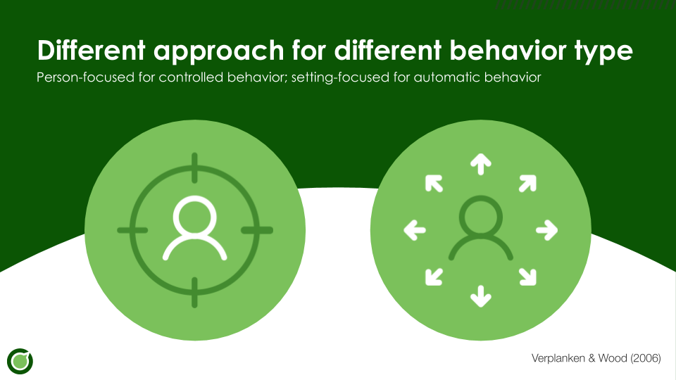 Uit onderzoek (Verplanken & Wood, 2006) blijkt hoe belangrijk het is om de aanpak af te stemmen op het soort gedrag. Zo blijkt dat er een verband is tussen zogenaamd zwak gewoontegedrag (oftewel, gedrag dat je bewust kunt controleren) en intenties. Namelijk, hoe sterker je intenties zijn om dat specifieke gedrag uit te voeren, hoe vaker je het ook daadwerkelijk doet. Dit geeft dus aan dat je bewust gedrag kunt sturen door je intenties te veranderen. De onderzoekers vonden echter geen verband tussen automatisch gedrag en intenties. Hoe sterker de gewoonte (en dus hoe automatischer het gedrag), hoe minder het uitmaakt wat je er over denkt.