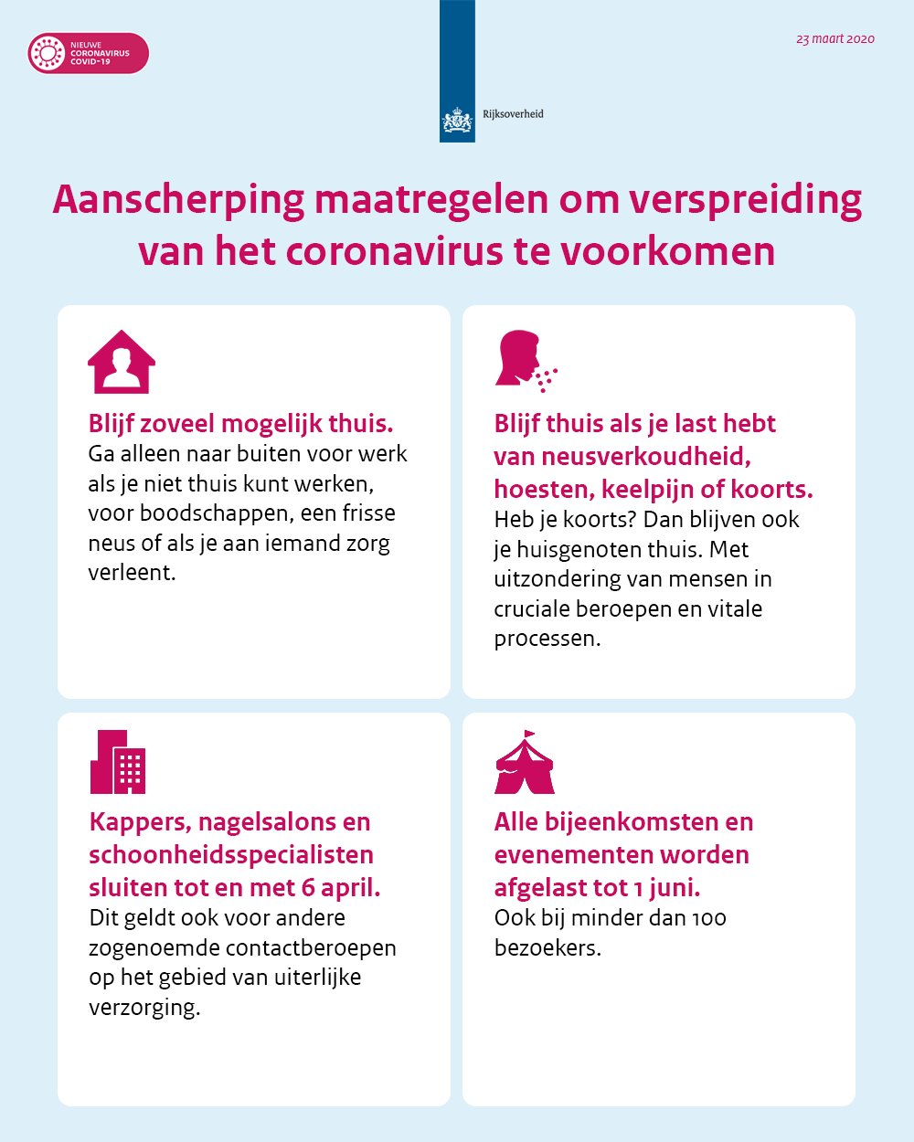 Sinds het afkondigen van de eerste regels (“Vanaf dit moment stoppen we met handenschudden”, Persconferentie 9 maart 2020) zijn er langzaamaan steeds meer veranderingen gekomen in de regels waar iedereen zich aan moet houden. Allerlei instanties en bedrijven werden (tijdelijk) gesloten, denk aan scholen, kinderopvang, horeca, kappers en sportscholen. Iedereen werd opgeroepen om zoveel mogelijk thuis te blijven en minimaal 1.5 meter afstand te houden van anderen. En dit is slechts een greep uit de maatregelen waar we ons aan te houden hebben.