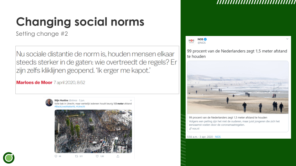 Behalve de aangepaste regelgeving vond er ook een behoorlijke verandering plaats in sociale normen. Welk gedrag wel en niet geaccepteerd wordt, is in korte tijd behoorlijk veranderd. Een paar maanden geleden keek niemand raar op als ze mensen dicht bij elkaar zagen zitten of staan. Tegenwoordig wordt daar vaak afkeurend op gereageerd. Waar het voor maart prima was om met een grote groep mensen thuis af te spreken, wordt dat twee maanden later als heel onverstandig gezien.