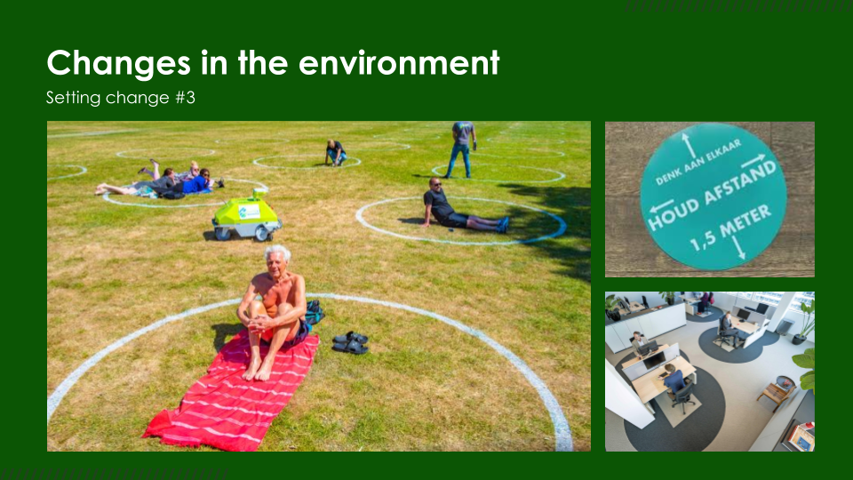 Ten slotte zijn er veel veranderingen geweest in onze fysieke omgeving. Winkels hebben bij de kassa strepen op de grond gezet om aan te geven waar je wel en niet mag staan. In openbare parken zijn cirkels op de grond getekend om duidelijk te maken waar je wel en niet mag zitten. Op de terrassen en in restaurants zijn duidelijke protocollen opgesteld. Tafels staan verder uit elkaar en er zijn afscheidingen aangebracht zodat je niet meer zomaar het terras kunt oplopen. Al deze veranderingen maken het een stuk makkelijker om je aan de regels te houden.