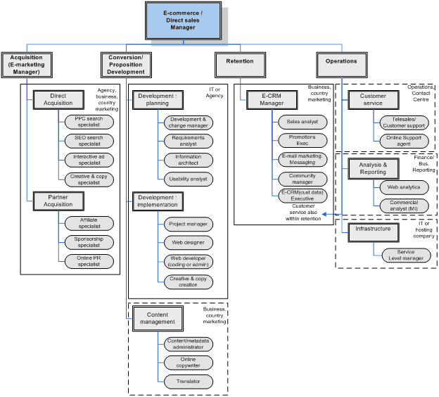 Een bericht op Marketingfacts (uit 2005) over de verantwoordelijken binnen e-commerce maakt eigenlijk al wel duidelijk dat je voor e-commerce idealiter iets meer personen nodig hebt dan één webmaster. Helaas is het voor veel bedrijven niet haalbaar alle taken intern op te pakken.