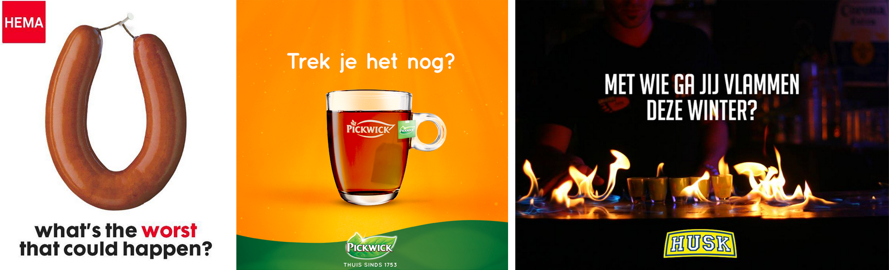 Van de eerder genoemde voorbeelden doet Pickwick het dus het beste, zij zijn de enige met een dubbele woordspeling. Ook met dierendag (“Kat in het bakkie”) lieten zij weer zien dat ze het goed onder de knie hebben. Verder geven ook Heineken met het WK voetbal (“We zullen vanmiddag tot de bodem moeten gaan mannen”) en Husk (“Met wie ga jij vlammen deze winter?”) het goede voorbeeld. Hun woordgrappen met dubbele woordspeling zijn dus niet per sé grappiger dan de woordgrappen van de andere bedrijven welke een enkele woordspeling bevatten.