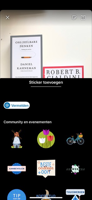 In LinkedIn Stories kun je zowel foto’s als video’s plaatsen. De maximale lengte van video is 20 seconden. Door te klikken op het plusje bij ‘uw verhaal’ kun je een foto of video toevoegen. Je kunt ervoor kiezen om een foto of video uit je cameraroll up te loaden of je maakt deze direct vanuit Stories. Zodra je media hebt geüpload, zie je de mogelijkheid om iemand te taggen en je kunt eventueel tekst of een sticker toevoegen. Persoonlijk ben ik geen fan van de stickers.