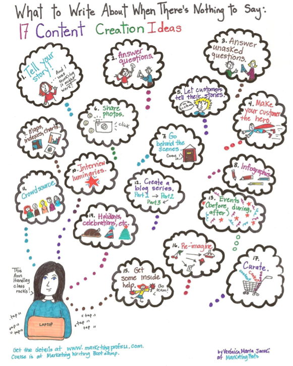 En, besef te allen tijde dat zich binnen je doelgroep zowel visuele als tekstuele personen zullen bevinden. Bijgaand een leuke infodoodle met allerhande contentideeën op een rij: