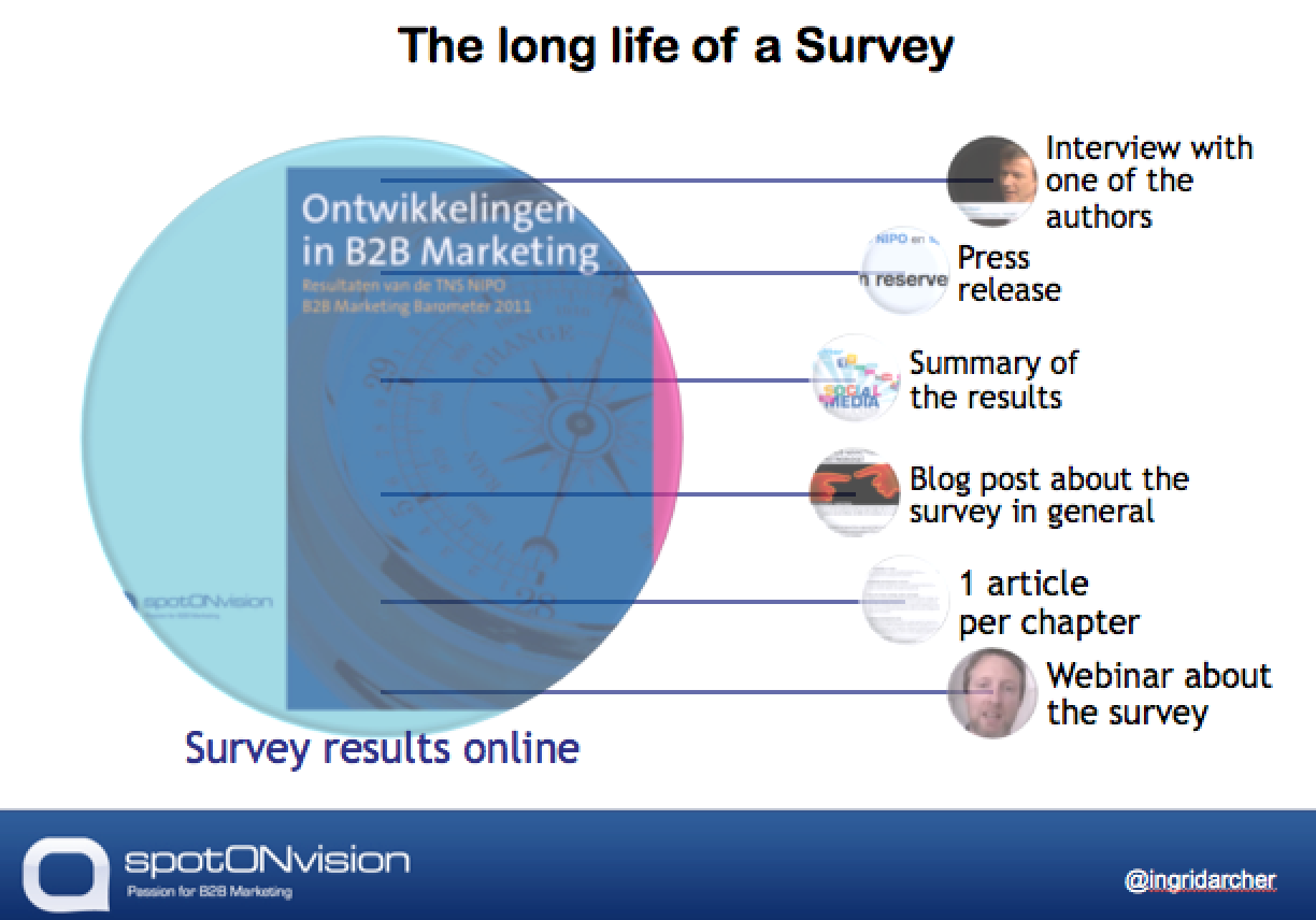De ‘Rule of 5’ heb ik wel eens toegelicht, een regel waarbij je meteen al 5 manieren bedenkt in de ontwerpfase van je content. Denk bijvoorbeeld aan een whitepaper die je eerst in een serie artikelen laat verschijnen, vervolgens als compleet document met daarbij een video-interview met de auteur en wellicht als een infographic of illustratie als het onderwerp zich daar goed voor leent.