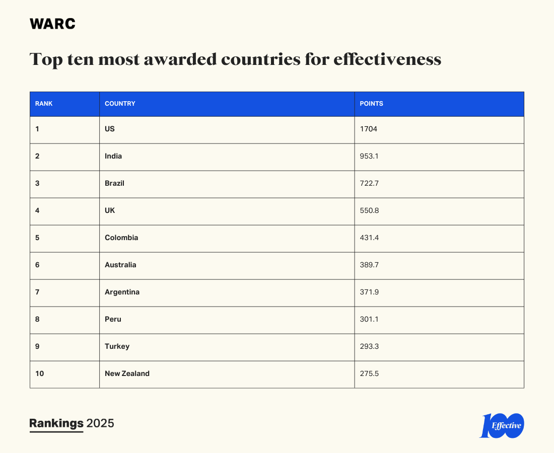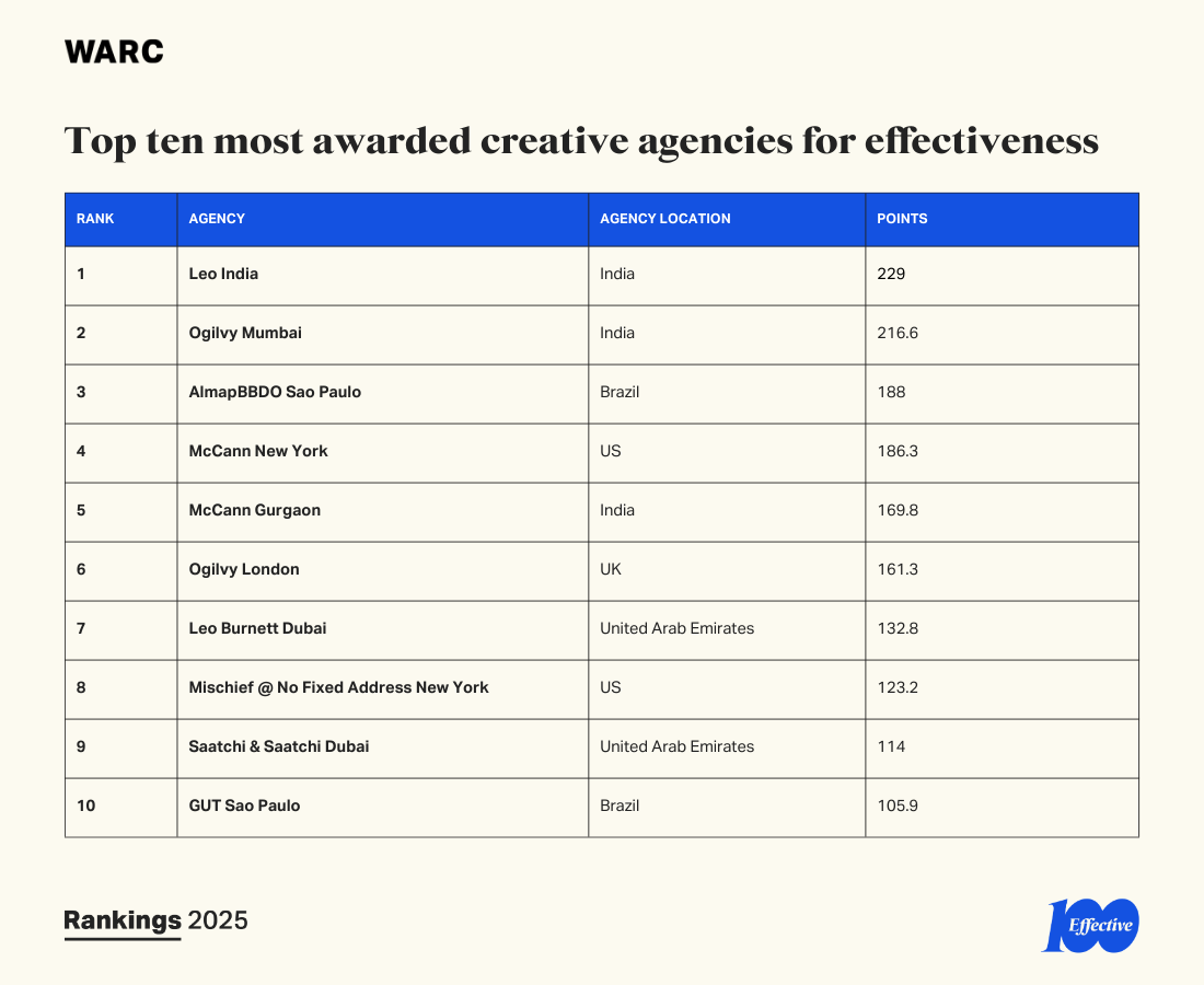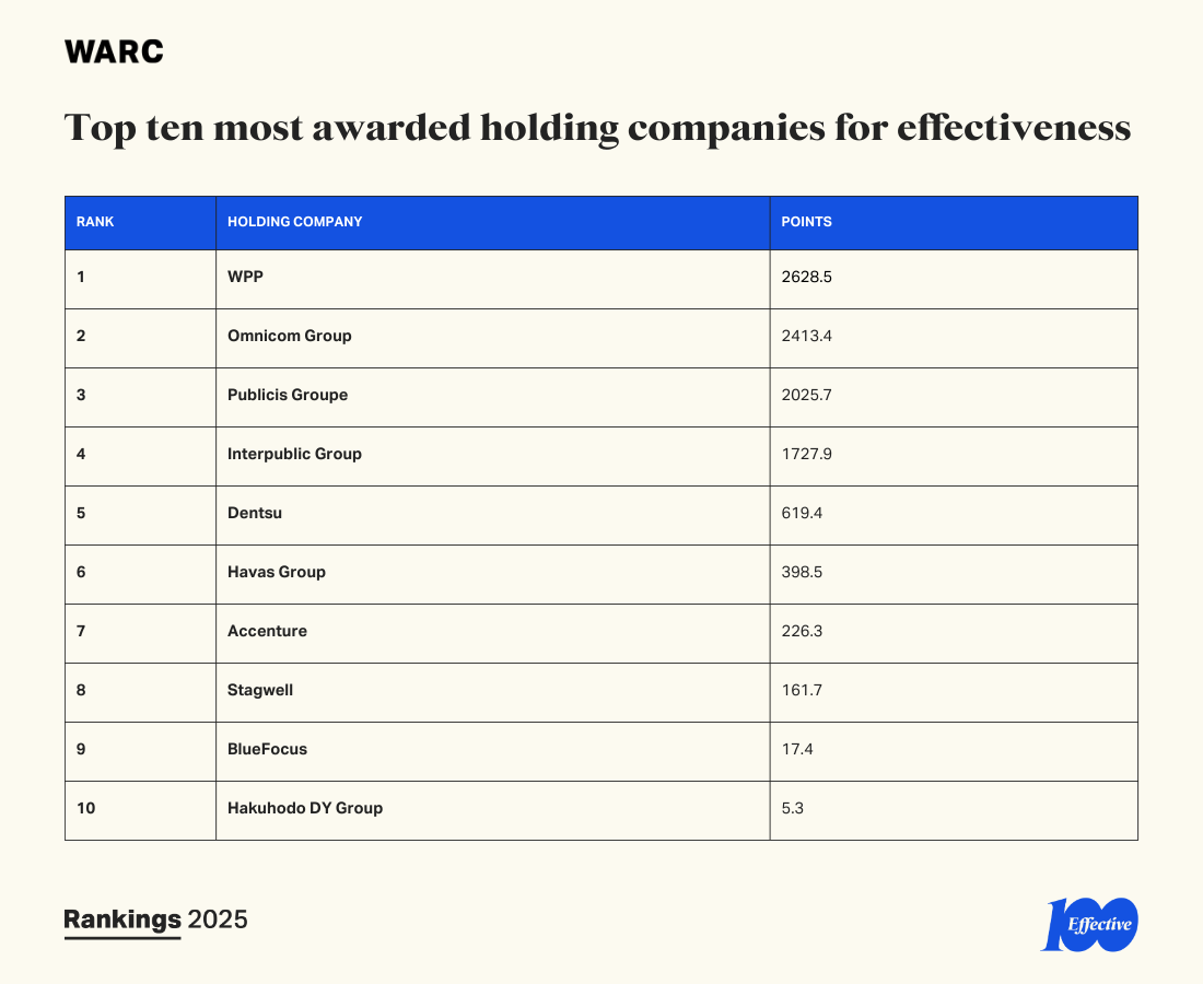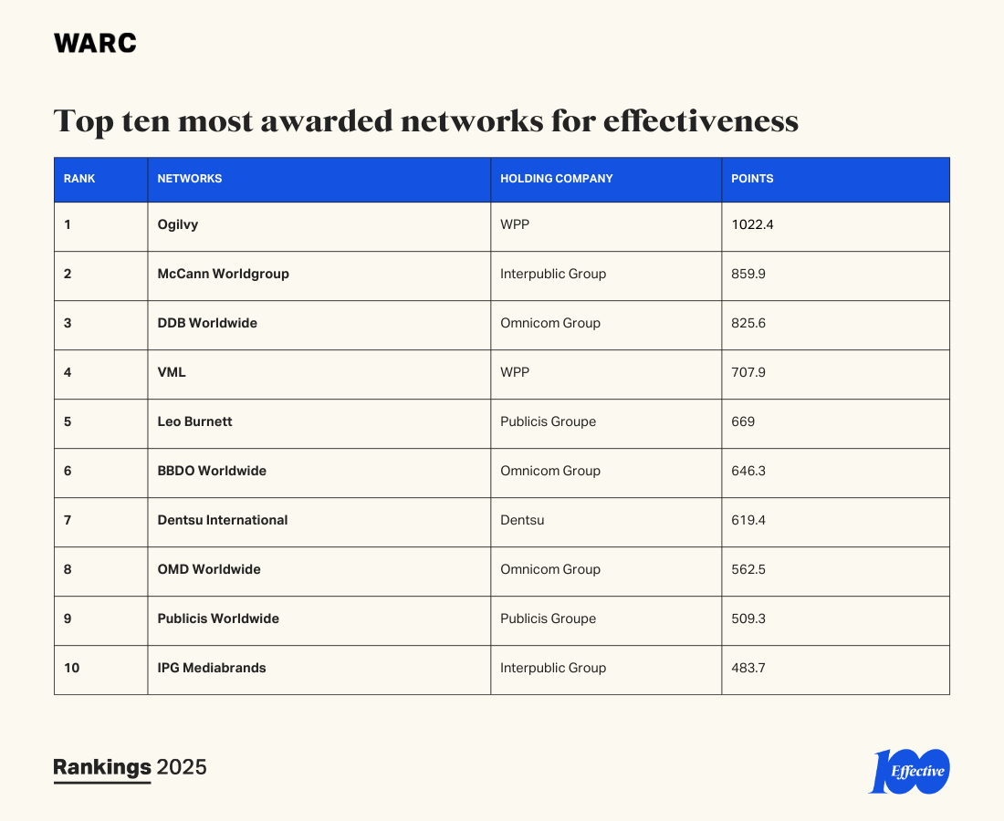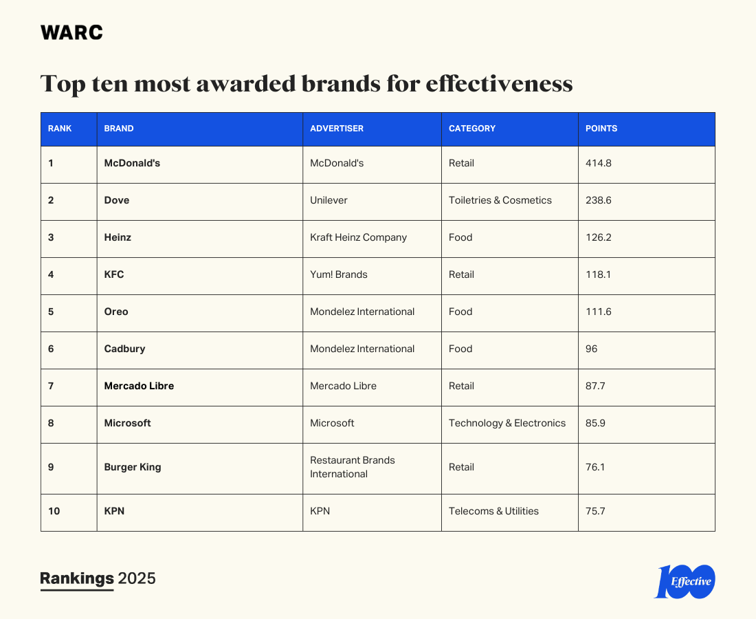 De top-10 hoogst gerangschikte campagnes en bedrijven in de Warc Rankings Effective 100 2025 zijn: