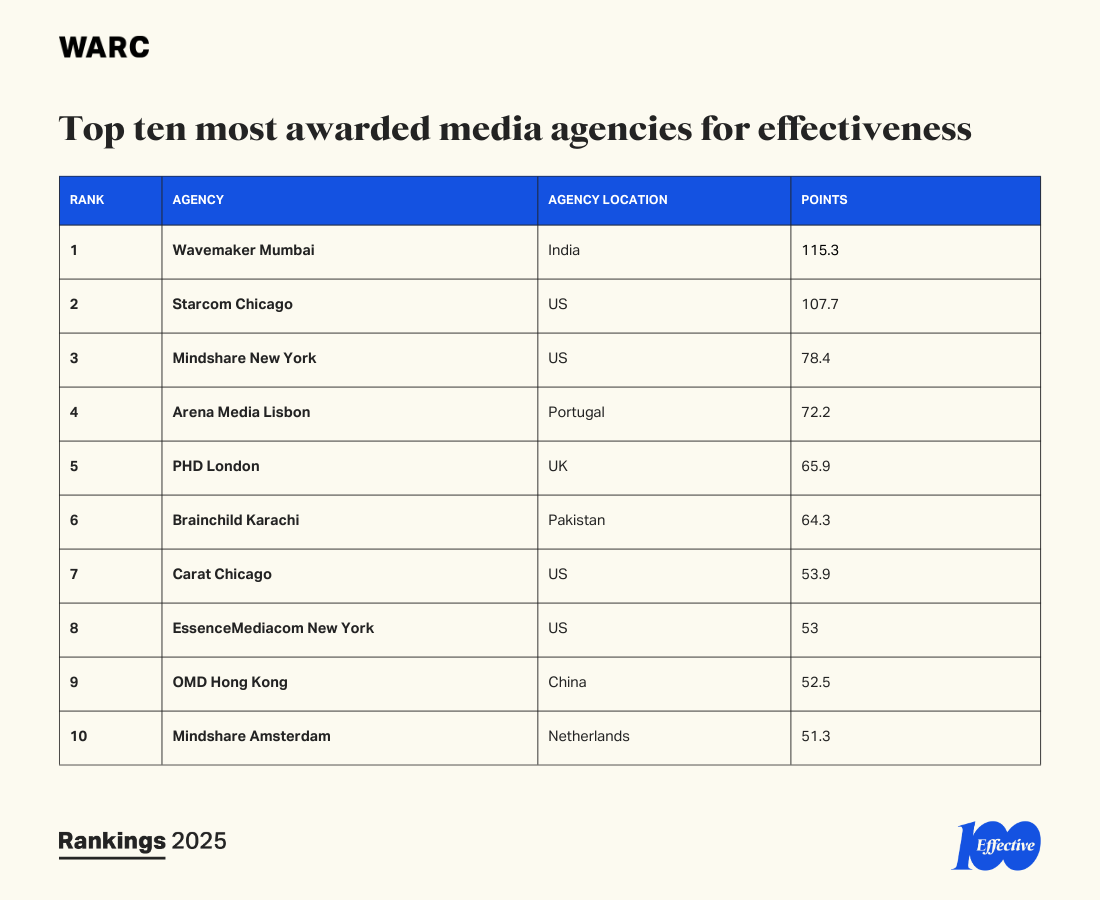 Wavemaker Mumbai, vorig jaar tweede, staat nu op pole position in de ranglijst van mediabureaus voor effectiviteit, met drie campagnes in de top-100 voor Cadbury, Oreo en Colgate.