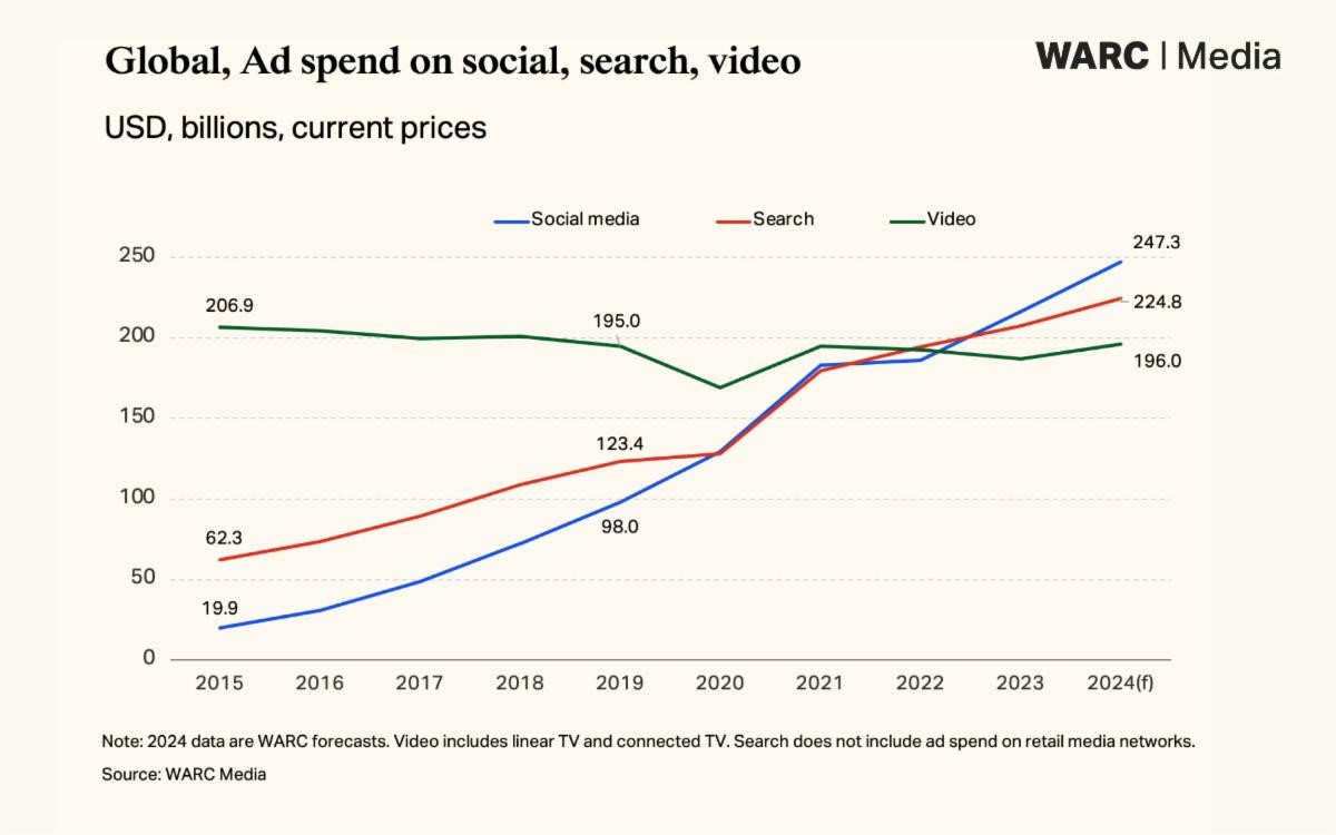Volgens de laatste voorspellingen van Warc Media zijn sociale media nu wereldwijd het grootste kanaal qua advertentie-investeringen, nadat ze vorig jaar de betaalde zoekresultaten hebben ingehaald, en zullen ze in 2024 naar verwachting in totaal 247,3 miljard dollar bedragen, een stijging van 14,3% op jaarbasis.